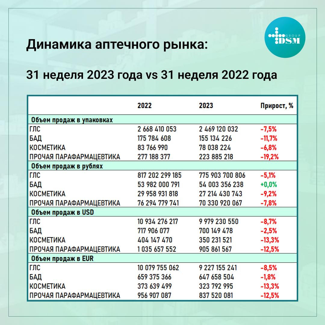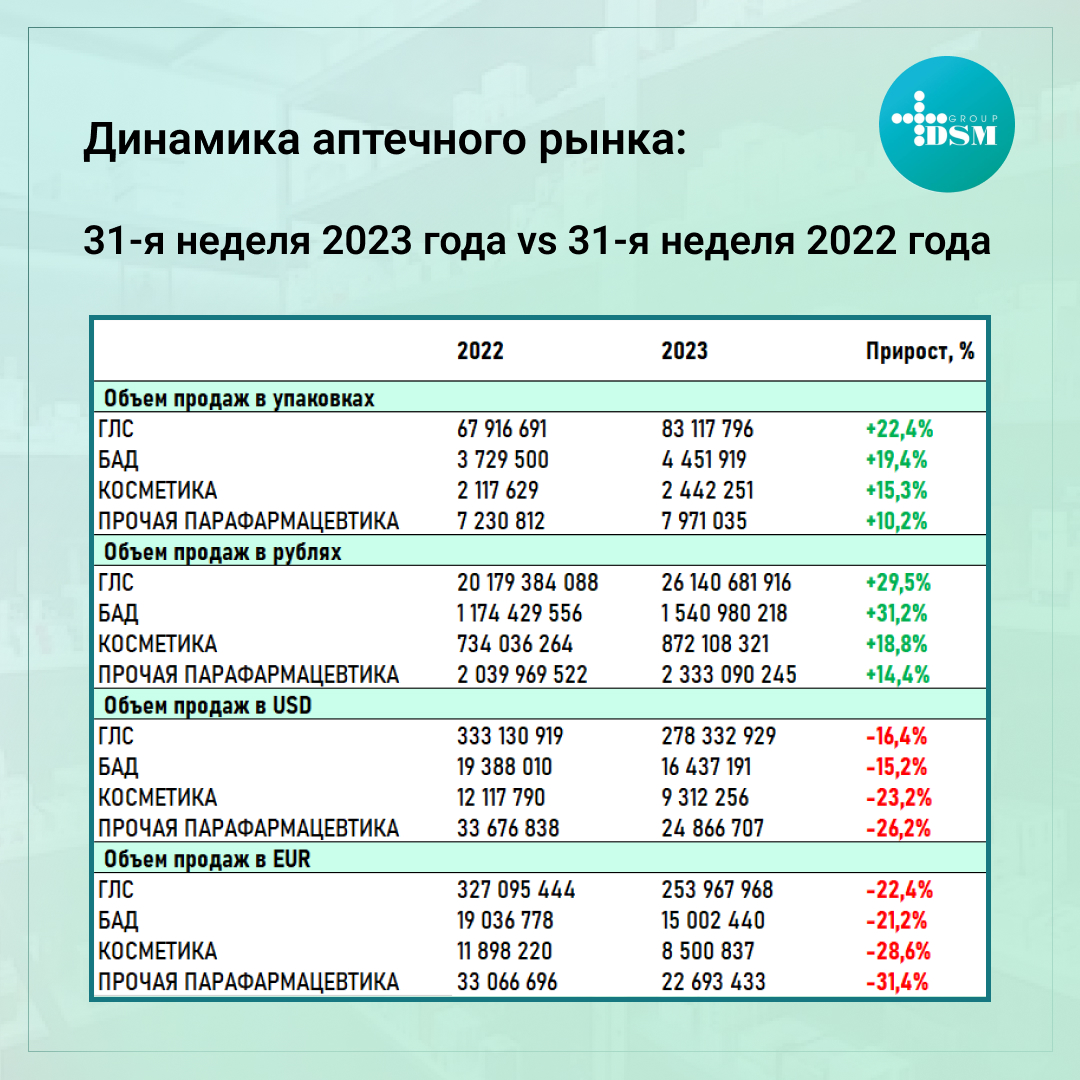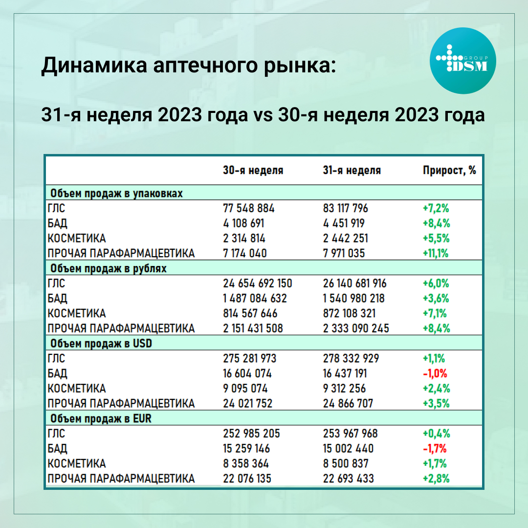 Динамика аптечного рынка на 31-й неделе 2023 г. (31 июля 2023 – 6 августа 2023)
