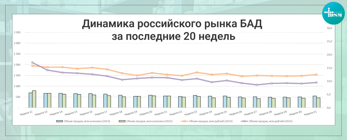 Аптечные продажи за 31 неделю 2023 года снизились относительно аналогичного периода прошлого года и в количественном, и в денежном выражении. Исключение – продажи БАД в рублевом выражении.