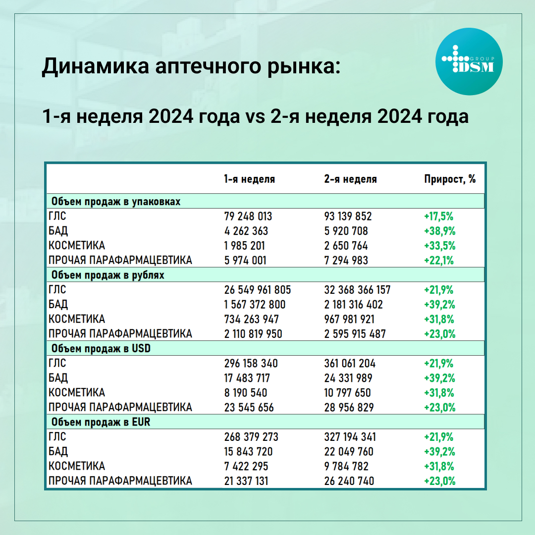 На 2-й неделе относительно предыдущей объем рынка ГЛС вырос на 17,5% в упаковках и 21,9% в рублях, рынок БАД – на 38,9% и 39,2% соответственно, косметики – на 33,5% и 31,8% соответственно.