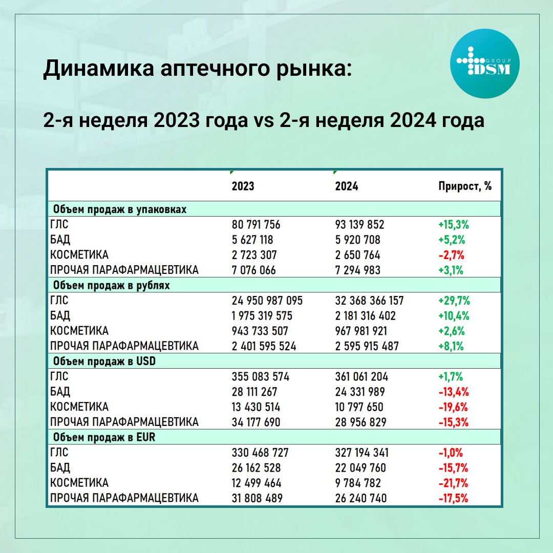 На 2-й неделе относительно аналогичного периода 2023 года наиболее значительный рост наблюдался на рынке ГЛС (+15,3% в упаковках и +29,7% в рублях). В группе БАД продажи выросли на 2,6% в упаковках и на 10,4% в рублях, в группе аптечной косметики падение в упаковках составило 2,7%, рост в рублях составил 2,6%.