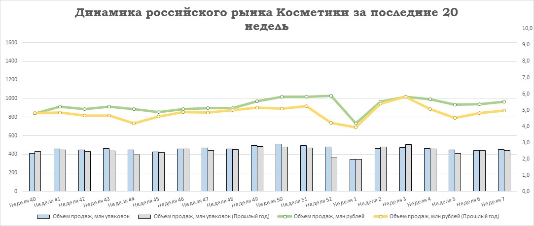 Относительно предыдущей недели у ЛП снизился объём продаж на -0,2% в упаковках, но при этом вырос на +0,8% в рублях. У БАД отмечен прирост на +2,5% в упаковках и на +0,5% в рублях. Аптечные продажи косметики выросли на +2,9% в упаковках и на +2,8% в рублях. Реализация прочей парафармацевтики увеличилась на +1,5% в рублях и в упаковках относительно уровня прошлой недели.