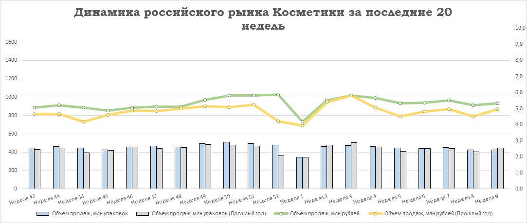 Относительно предыдущей недели у ЛП увеличился объём продаж на +2,7% в упаковках и на +4,9% в рублях. У БАД отмечен прирост продаж на +2,3% в упаковках и на +5,0% в рублях. Аптечные продажи косметики выросли на +0,3% в упаковках и на +2,7% в рублях. Реализация прочей парафармацевтики снизилась на -1,6% в упаковках, но при этом выросла на +0,5% в рублях относительно уровня 8-й недели.