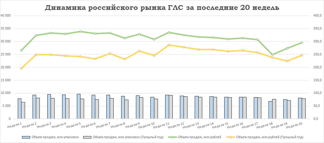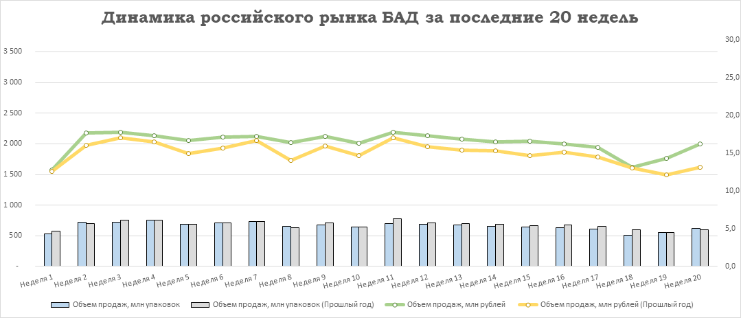 Относительно предыдущей недели у лекарственных препаратов увеличился объём продаж на +6,9% в упаковках и на +8,0% в рублях. У БАД отмечен прирост продаж на +11,8% в упаковках и на +13,5% в рублях. Аптечные продажи косметики увеличились на +14,1% в упаковках и на +14,8% в рублях. Реализация прочей парафармацевтики также выросла на +10,7% в упаковках и на +10,8% в рублях относительно уровня 19-й недели.