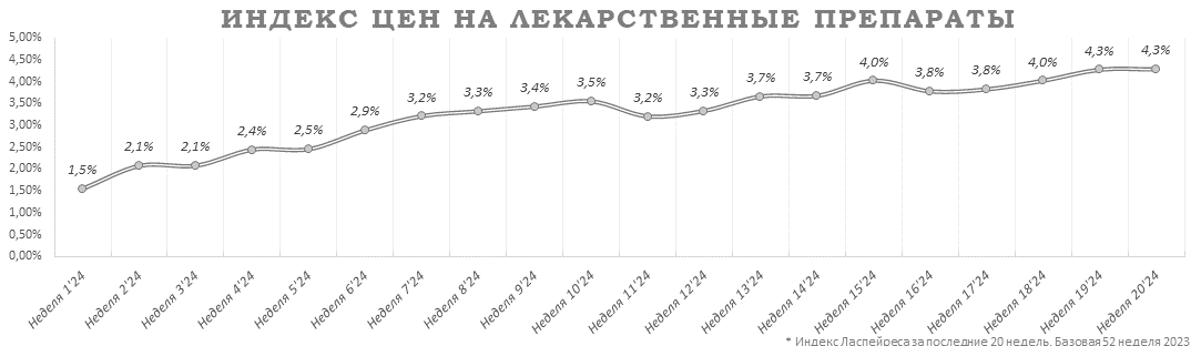 Индекс цен на 20-й неделе составил 4,3%. Обратите внимание, индекс цен обновлён, базовая 52 неделя 2023 года.