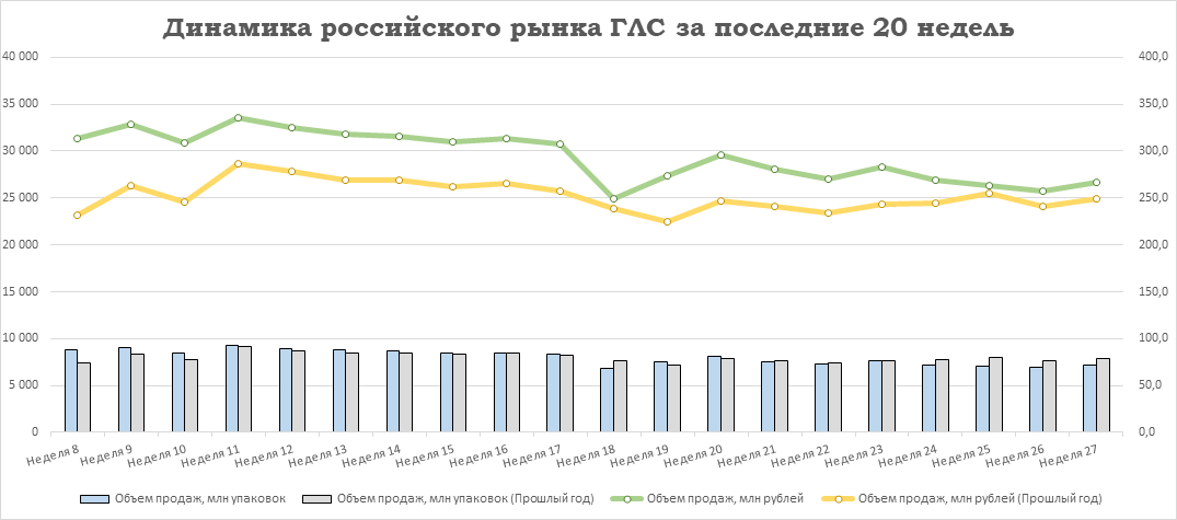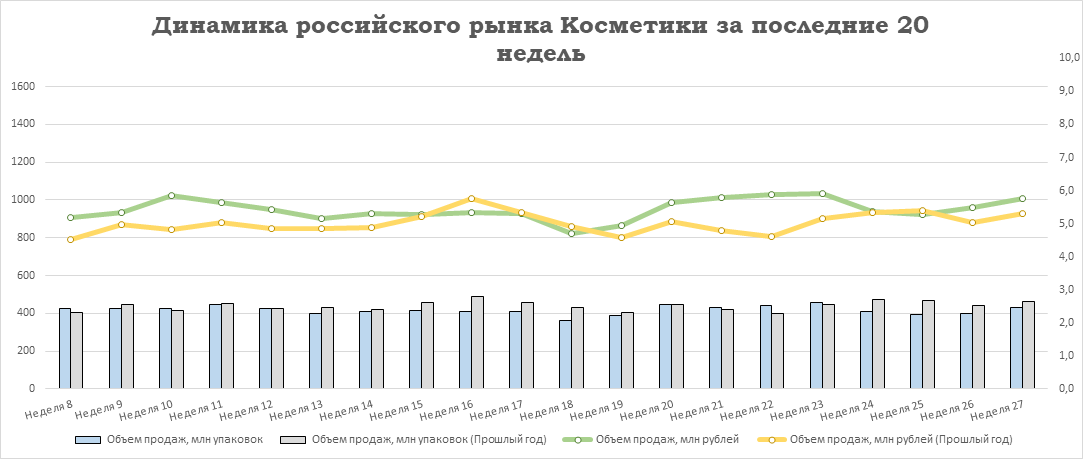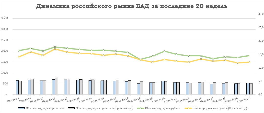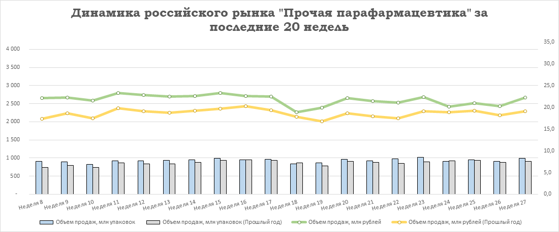 Относительно предыдущей недели у лекарственных препаратов увеличился объём продаж на +3,8% в упаковках и на +3,9% в рублях. У БАД отмечен прирост продаж на +4,3% в упаковках и на +5,7% в рублях. Аптечные продажи косметики увеличились на +8,9% в упаковках и на +4,9% в рублях. Реализация прочей парафармацевтики выросла на +10,0% в упаковках и на +9,3% в рублях относительно уровня 26-й недели.