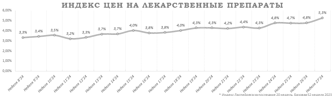 Индекс цен на лекарственные препараты на 27-й неделе составил 5,3%.