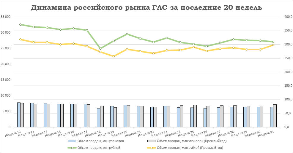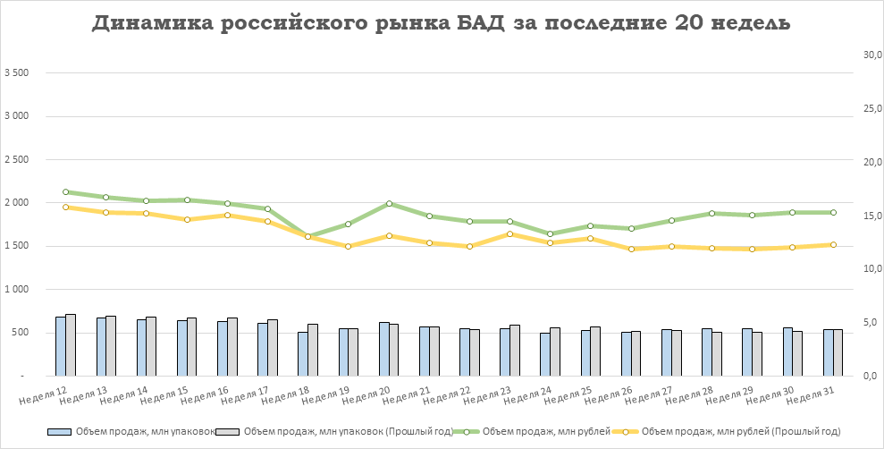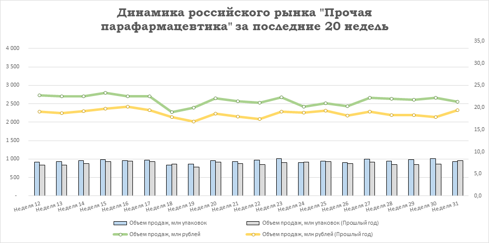 Относительно предыдущей недели у лекарственных препаратов снизился объём продаж: на -1,6% в упаковках и на -1,3% в рублях. У БАД отмечено падение продаж на -3,5% в упаковках и прирост на +0,1% в рублях. Аптечные продажи косметики снизились на -5,1% в упаковках и на -2,9% в рублях. Реализация прочей парафармацевтики сократилась на -8,1% в упаковках и на -4,3% в рублях относительно уровня 30-й недели.