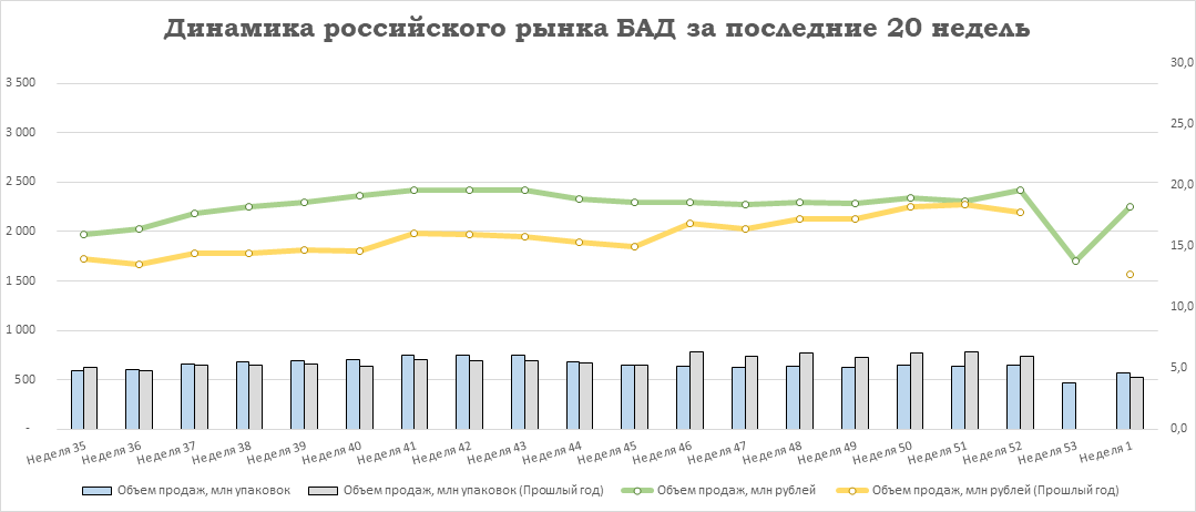 Относительно предыдущей недели у лекарственных препаратов объём продаж вырос на +20,0% в упаковках и на +24,9% в рублях. Продажи БАД увеличились на +21,5% в упаковках и на +32,8% в рублях. Аптечные продажи косметики выросли на +28,7% в упаковках и на +26,6% в рублях. Реализация прочей парафармацевтики показала прирост на +21,1% в упаковках и на +29,5% в рублях.