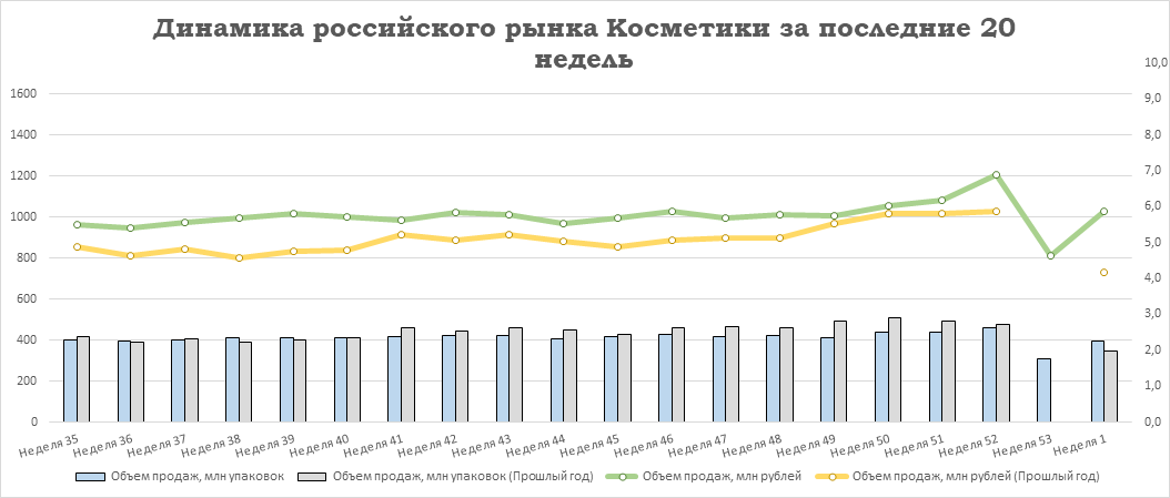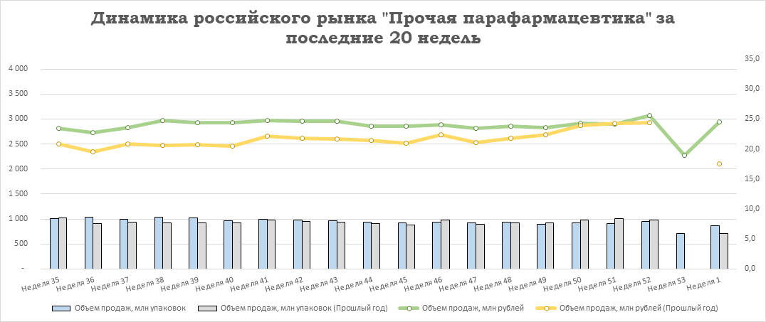 У ЛП наблюдается снижение продаж на -2,7% в упаковках (77 млн упак.) и увеличение на +16,8% в рублях (31 млрд руб.). Показатели БАД выросли на +8,9% в упаковках (4,6 млн упак.) и на +44,2% в рублях (2,3 млрд руб.). У косметики продажи увеличились на +13,7% в упаковках и на +40,1% в рублях: 2,3 млн упаковок и 1 млрд рублей. Продажи прочей парафармацевтики выросли на +20,5% в упаковках (7,2 млн упак.) и на +39,9% в рублях (2,9 млрд руб.).