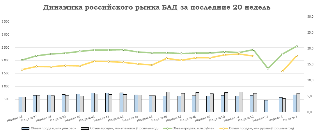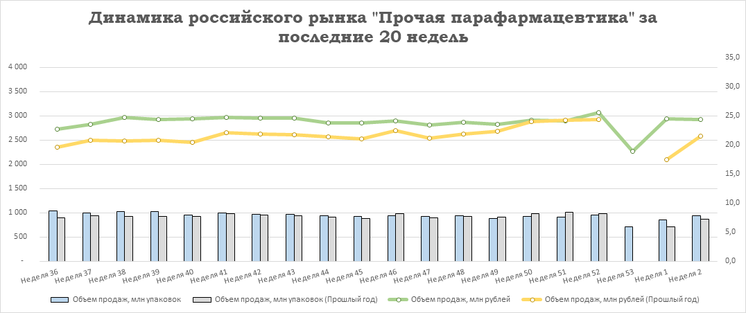 У ЛП наблюдается снижение продаж на -5,2% в упаковках (164 млн упак.) и увеличение на +11,2% в рублях (66 млрд руб.). Показатели БАД упали на -0,8% в упаковках (10 млн упак.) и выросли на +27,6% в рублях (4,8 млрд руб.). У косметики продажи увеличились на +2,9% в упаковках и на +25,9% в рублях: 4,8 млн упаковок и 2,1 млрд рублей. Продажи прочей парафармацевтики выросли на +13,8% в упаковках (15 млн упак.) и на +25,4% в рублях (5,9 млрд руб.).