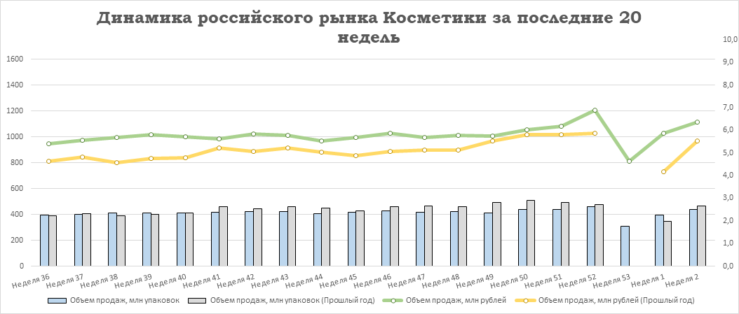 У ЛП наблюдается снижение объёма продаж на -7,3% в упаковках и прирост на +6,6% в рублях. У БАД было отмечено падение реализации на -7,3% в упаковках и увеличение на +16,6% в рублях. Аптечные продажи косметики упали на -5,2% в упаковках, но выросли на +15,2% в рублях. Реализация прочей парафармацевтики увеличилась на +8,2% в упаковках и на +13,5% в рублях.